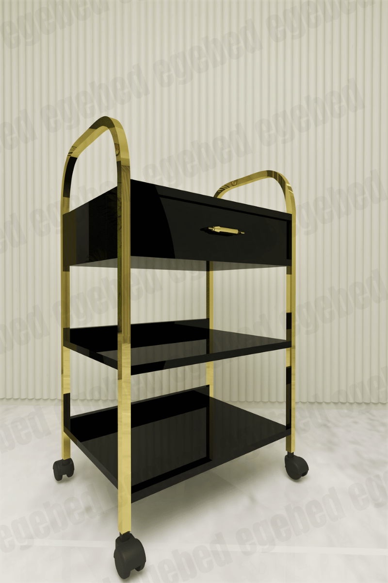 Gold Cilt Bakım Yatağı Seti – Plastik Ayaklı Tabure ve Gold Detaylı Tek Çekmeceli Etejer (Azerbaycan Model)